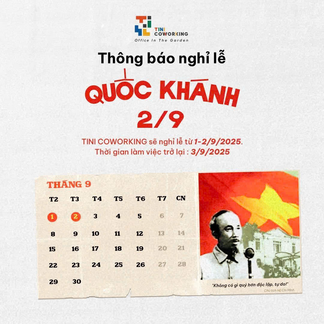 THÔNG BÁO LỊCH NGHỈ LỄ 2/9 Kính gửi Quý khách hàng, Quý đối tác! TINI COWORKING xin thông báo lịch nghỉ lễ Quốc Khánh 02/09 như sau: 🚩 Thời gian